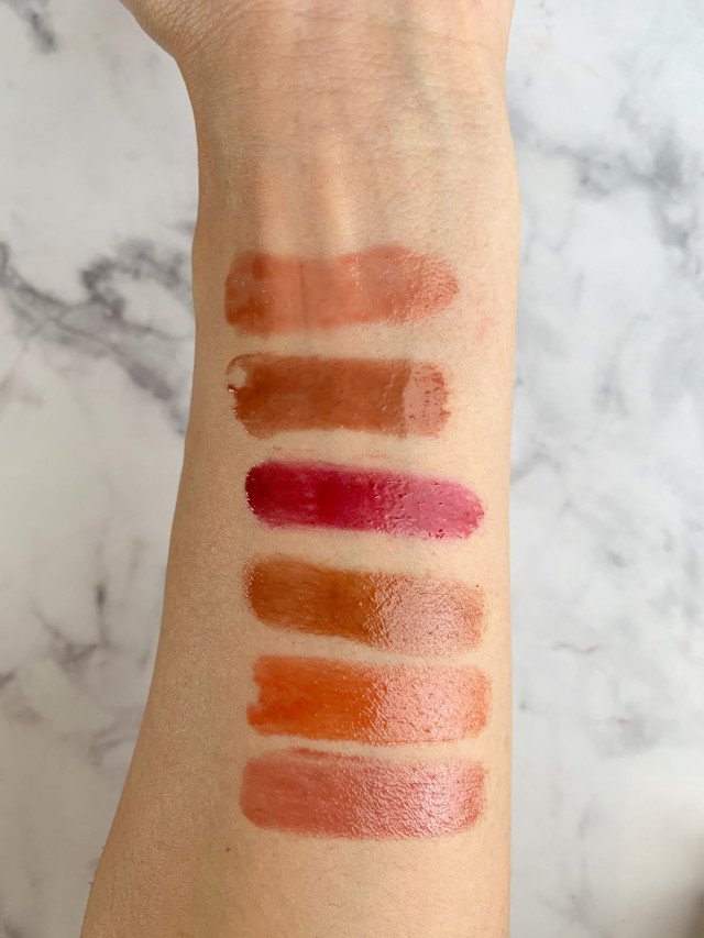 左から、「02 あざとORANGE」、「03 こなれBBEIGE」、「06 きまぐれBROWN」、「07 束縛RED」、「09 無敵テラコッタ」、「103 引きよせAPRICOT(限定)」、「104 脈ありPINK(限定)」。