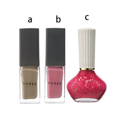a透け感のあるグレージュは服を選ばない万能カラー。THREE ネイルポリッシュ 07 ¥1,800