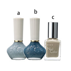 マットな質感が新しいポリッシュを取り入れたデザイン。bを薬指に、それ以外の指にaを塗り、根元にストーンを。先端のマット感をキープするため、ここで先にトップコートも塗っておく。cでフレンチにしたら完成。