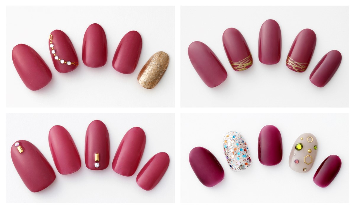 色っぽいワインレッドに、カラフルなアートをプラスしてカジュアルダウン。合わせるカラーは、くすんだベージュやグリーンなど、落ち着いたカラーを選ぶと、大人ポップな印象に。ワインレッドは単色塗りで楽しみ、カラフルアートのベースカラーはベーシックにするとバランスよく仕上がります。