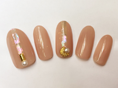 2.親指、中指にシェルシートを縦ラインに貼り、パールやパーツを置く。
