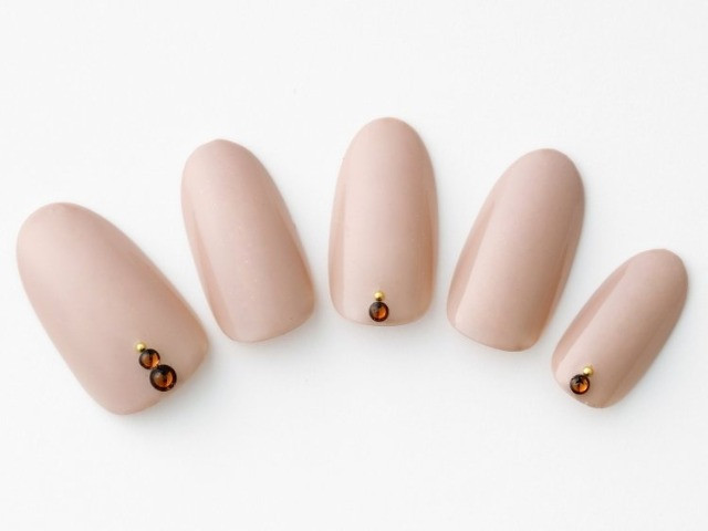 2 親指、中指、小指の根元にベースコートを塗り、ブラウンのラインストーンとゴールドのスタッズを置く。