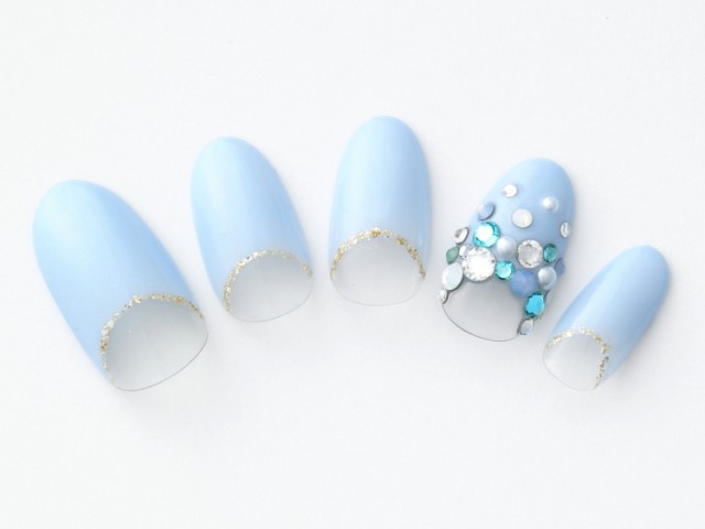親指と薬指はペールブルー、それ以外の爪はフレンチブルーをそれぞれ2度塗りしていく。丸と三角のゴールドのストーンをオン。