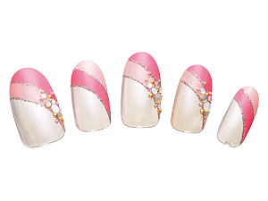 淡いパールピンクをベースにピーチピンクと濃ピンクで斜めダブルフレンチ。指によって上下のカラーをランダムにしたのがポイントです。オパール系のストーンとスタッズをサイドに並べて華やかに。