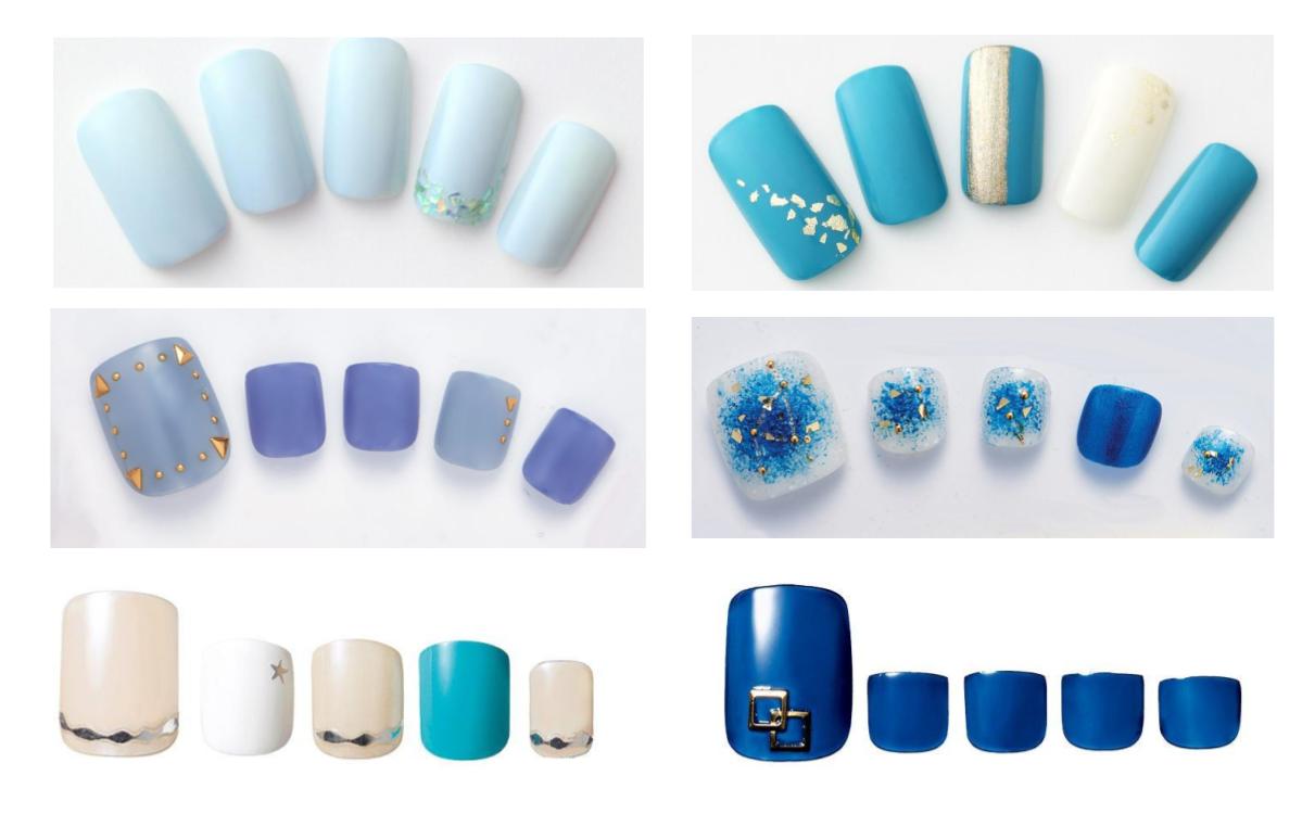 - 薬指にはメタリックブルー、それ以外にはパステルスノーカラーをベースに2度塗りする。
