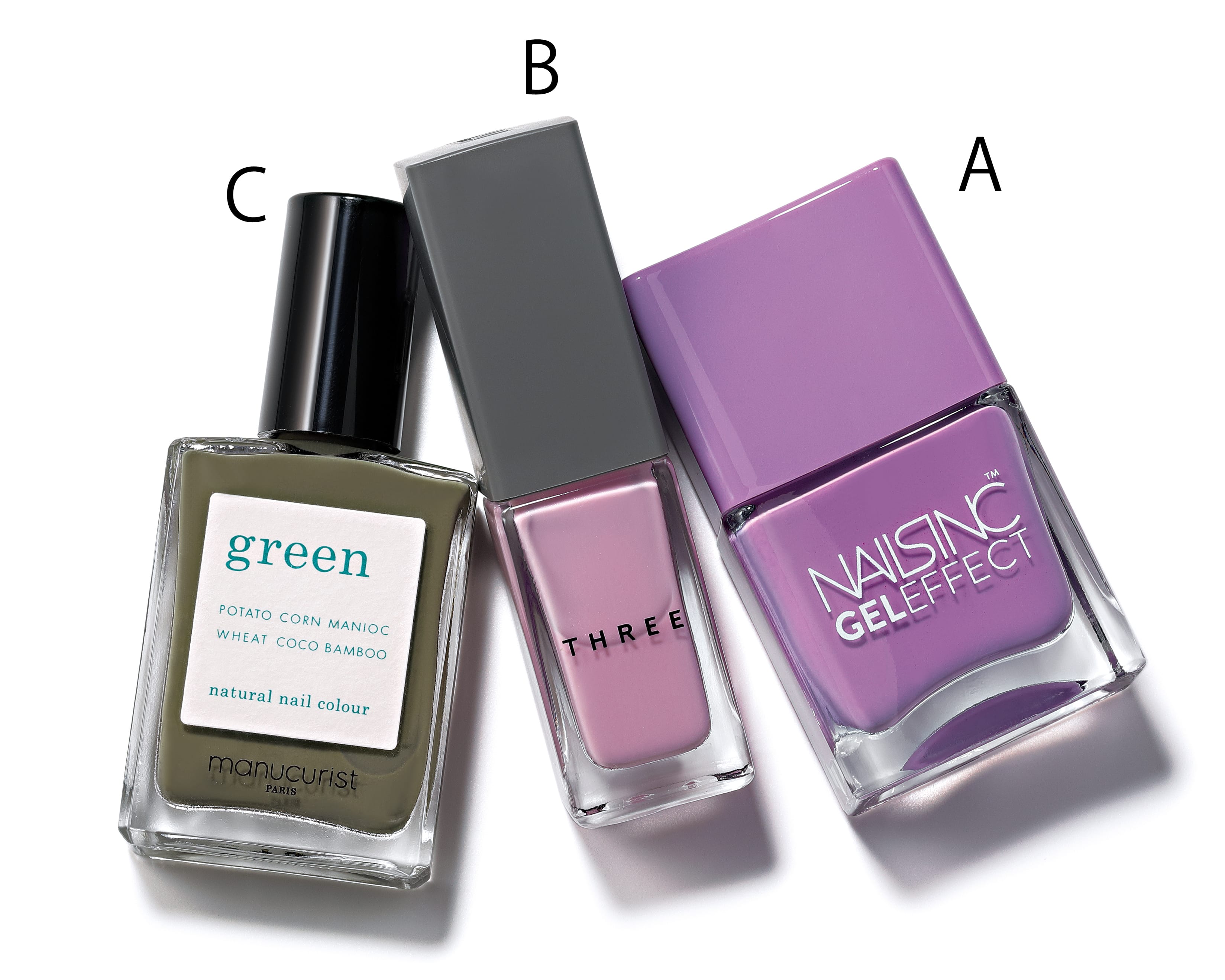旬カラーのライラック系濃淡2色とカーキを1:1の割合で配色したネイル。1色塗りだけと超簡単なのに、ハッとさせるカラーリングで、女らしいのに鮮度が高いおしゃれ上級者に格上げします。