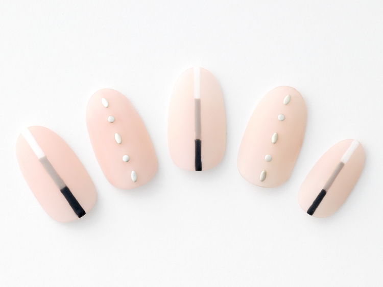 2.親指、中指、小指に、ホワイト、グレー、ブラックのポリッシュで縦ラインのアートを。