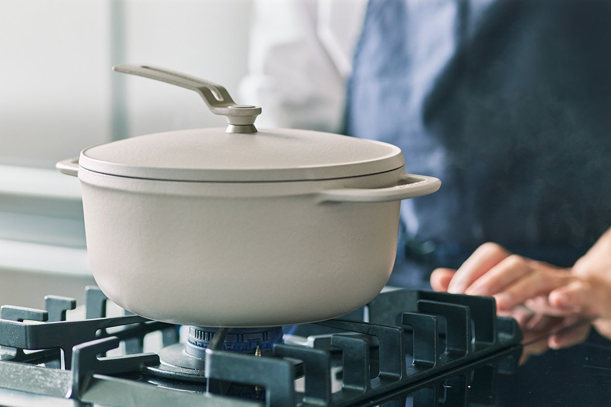 鋳物ホーロー鍋ブランド バーミキュラの「オーブンポット2」は、食材の水分を活かす無水調理に加え、余分な水分を瞬時に蒸発させて旨みを凝縮する新調理法「無水ベイク」を実現。さらに従来品から約30%の軽量化により扱いやすさも向上し、調理時間の短縮もかなえました。使い込んだ製品を溶かして再生する「リクラフトプログラム」にも対応し、長く愛用できるサステナブルな一台です。