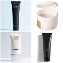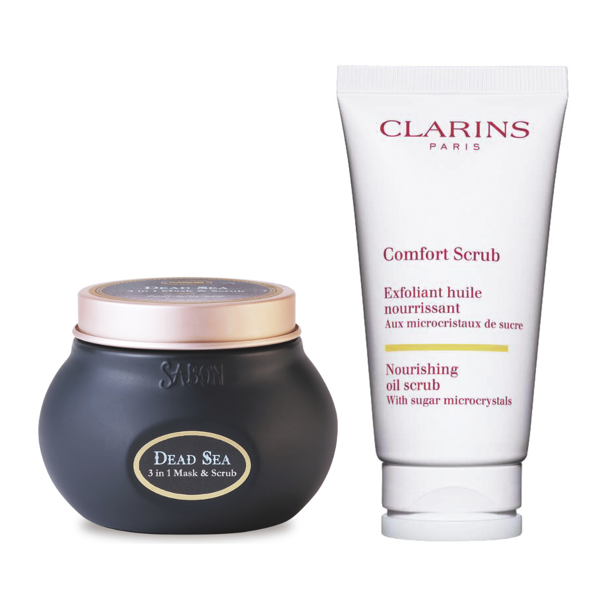 右から/水に溶ける砂糖由来のスクラブが毛穴の汚れや古い角質を穏やかに除去。クラランス コンフォート オイル スクラブ 50㎖ ¥4,950、死海の泥天然由来スクラブが、洗顔では落とし切れない汚れをオフ。SABON 3in1 マスク&スクラブ ローズブーケ 200㎖ ¥8,140