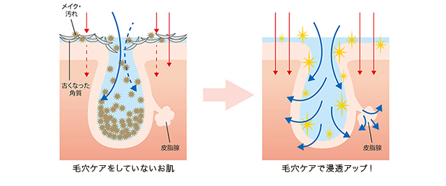 毛穴は毛が生えている穴ですので、あいているのがベスト。塞がれていたりすると、保湿ケアをしたくてもうるおい成分が浸透しにくくなります。まずは古い角質を取り除くことが冬を乗り越えるためのお手入れポイントです。