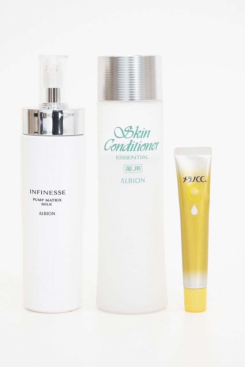 アルビオンの『アンフィネス パンプマトリクス ミルク』と『薬用スキンコンディショナー エッセンシャル N』を愛用。保湿力が高く、肌あれも防げます。メラノCCの美容液は、毛穴が気になっていたときに祥子におすすめされて、アンチエイジングを意識して使い始めました。(悠さん私物)