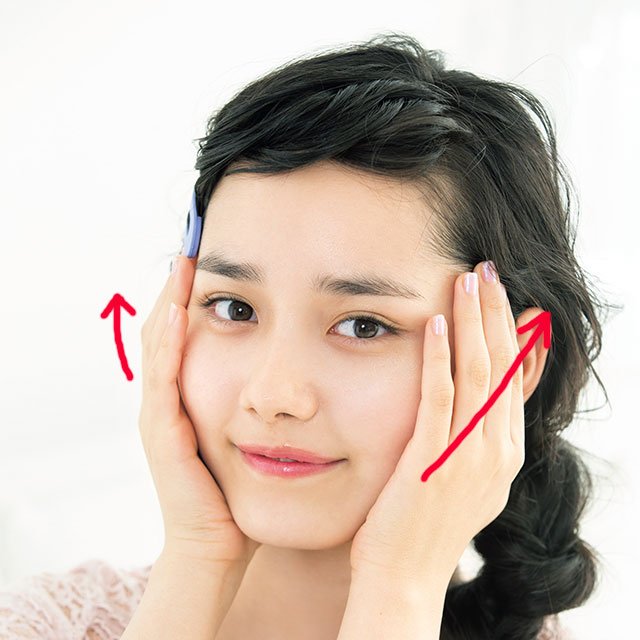 (1)顔の中心から外側に向かってさすり流したら、最後に顔を引き上げて3秒静止。ピンと張る膜感を形状記憶させる。