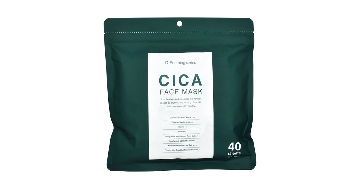 まずは、「最強コスパ」としてSNSの口コミでも話題になった「CICA マスク」。ストレスや外的刺激の多い環境で荒れがちな肌を落ち着かせ「D Soothing series」の大容量シートマスクです。