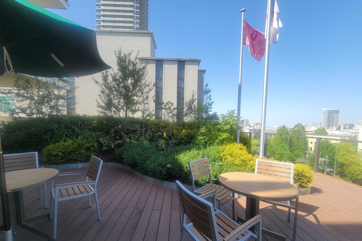 大阪の街並みを一望できるガーデンテラスや、まさかの「お茶室」もあるのが桃谷順天館の特徴。桃谷順天館には社員が活動する「茶道部」があるそうで、海外から来社される方々にも喜ばれているそう。徳川家の葵の家紋が入った棗や御釜がある歴史を感じる茶室で点てていただいたお抹茶を美味しくいただくと、それだけで気持ちがが穏やかになるような気が。四季ごとに庭園のお花も変わるそうで、おもてなしの心がユーザーファーストの製品開発にも深くかかわっているように感じました。