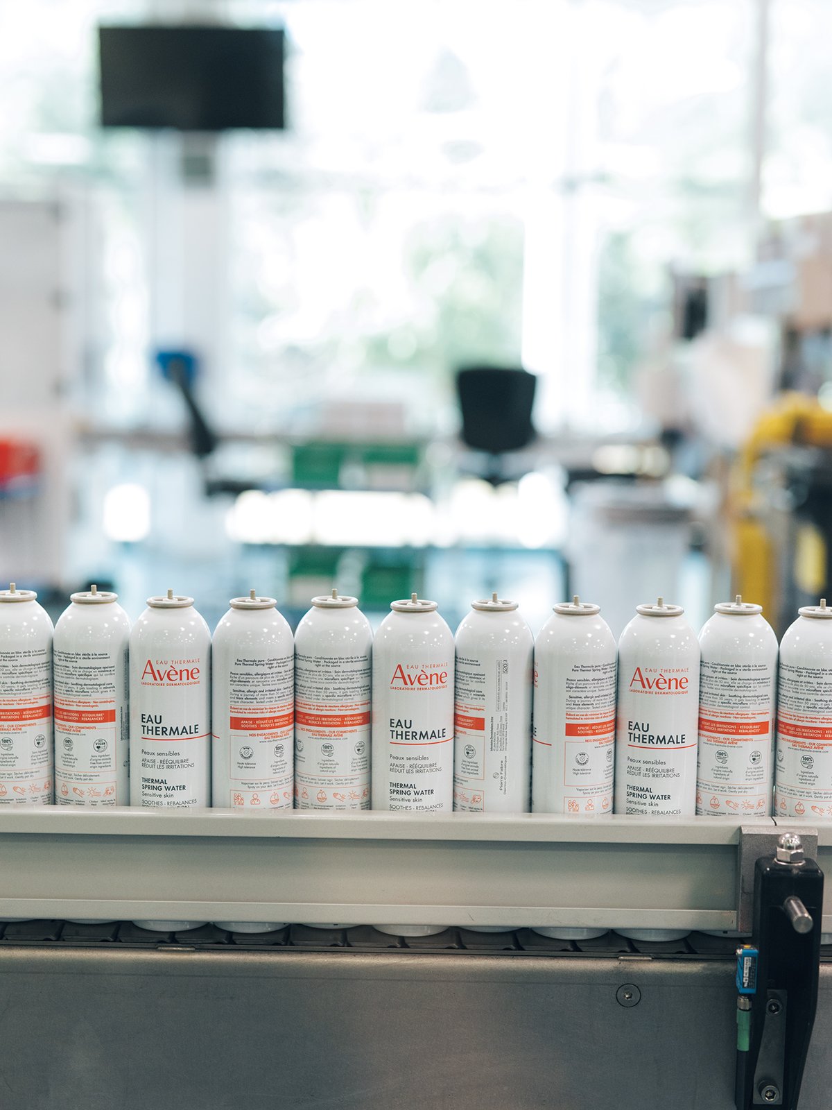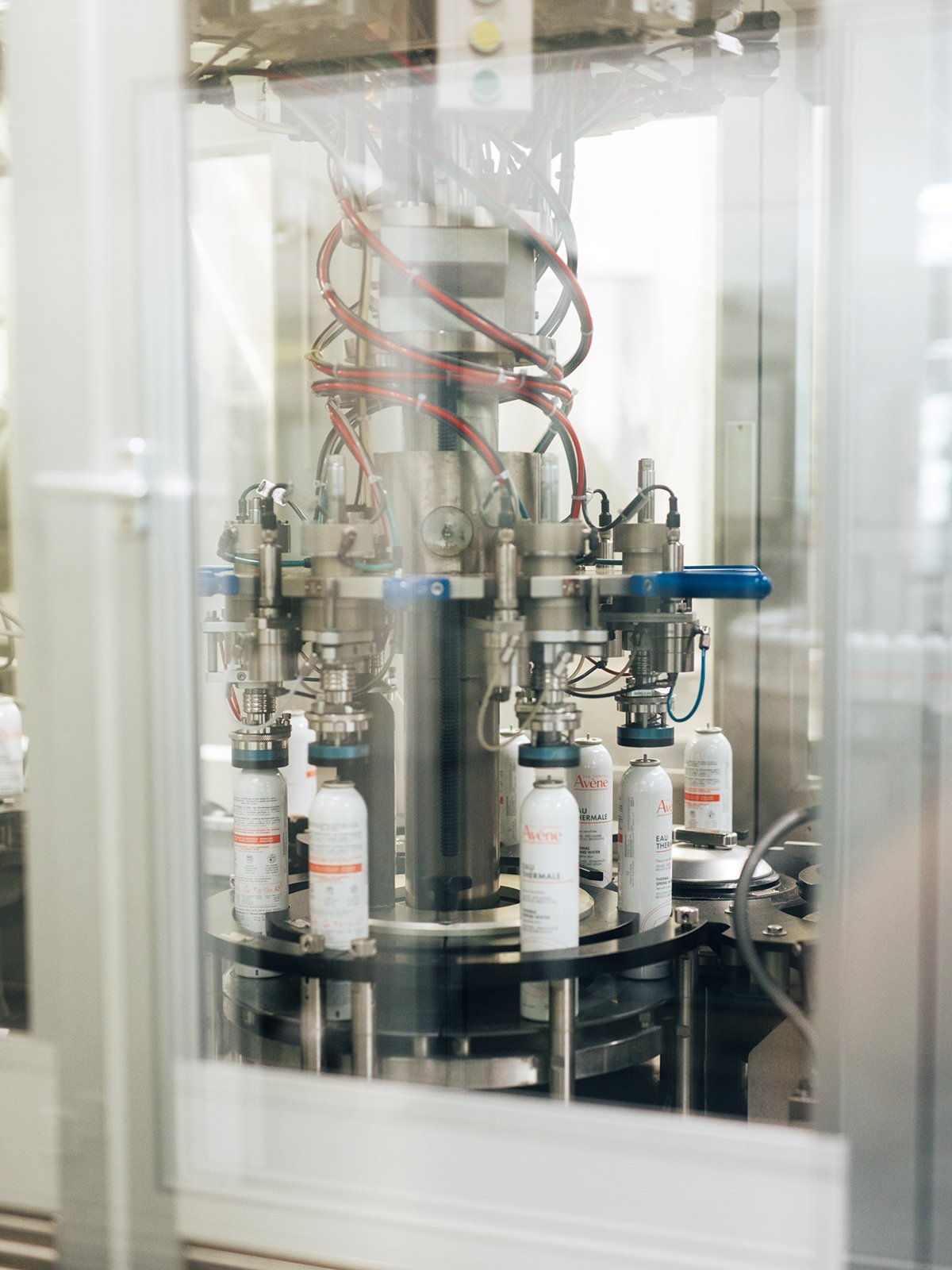 アベンヌ温泉水は、源泉から金属パイプを通ってすぐそばにある工場へと運ばれる。約170℃の熱滅菌トンネルを40分かけて通ったスプレー缶に充填され、すぐ蓋をされて密閉状態に。