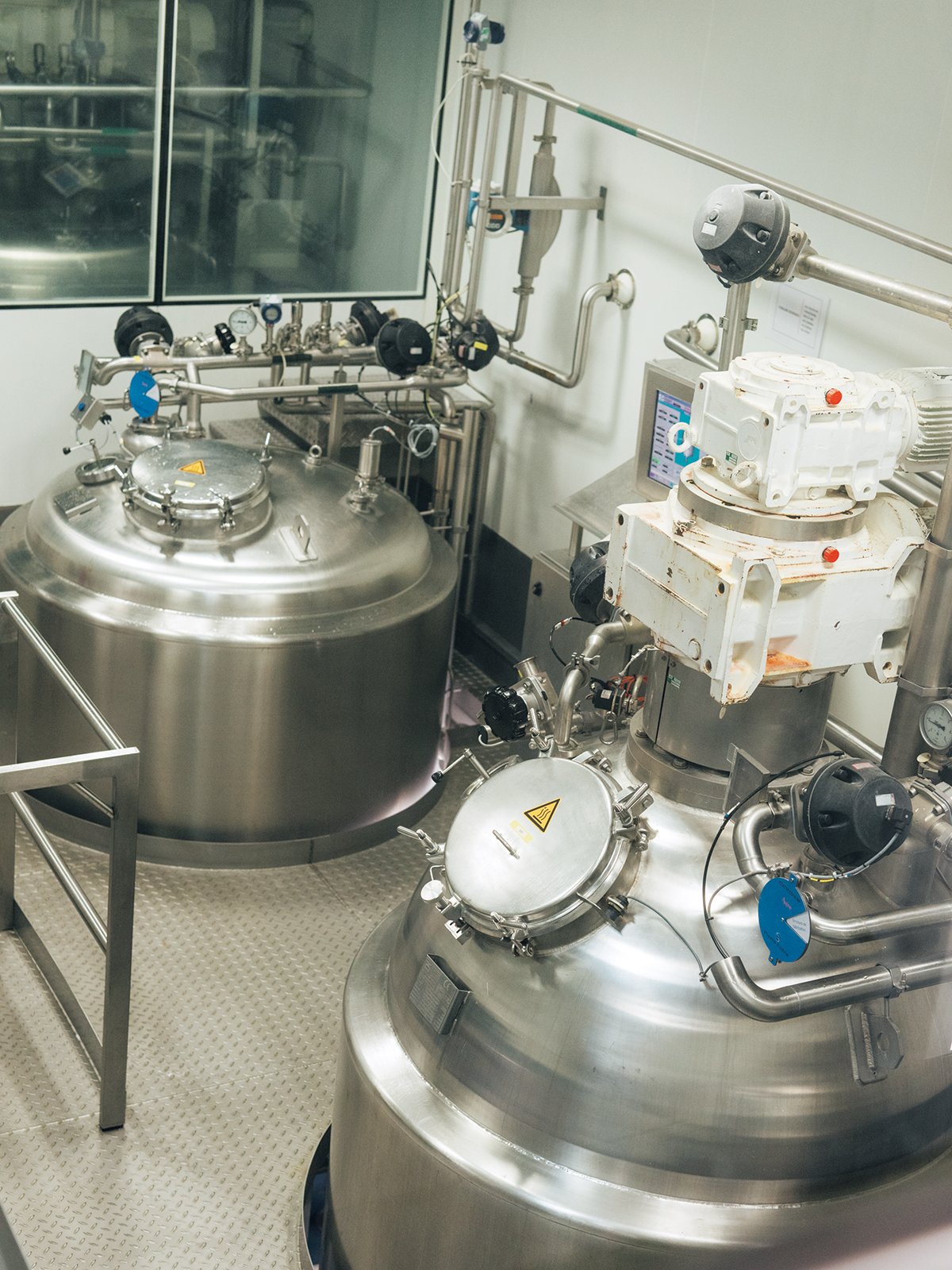 原料の検査後、大きな釜で温泉水とその他成分を攪拌。48時間かけて、テクスチャーやにおいなど問題がないか徹底的に調べて管理する。