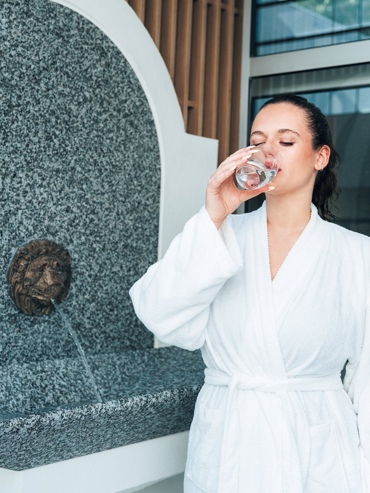 体の内側から温泉水を取り入れるのも、治療のひとつ。施設内で自由に温泉水が飲めるので、毎日約1.5Lを飲むことを推奨しているそう。アベンヌ温泉水が食物アレルギーの緩和をサポートすることも。