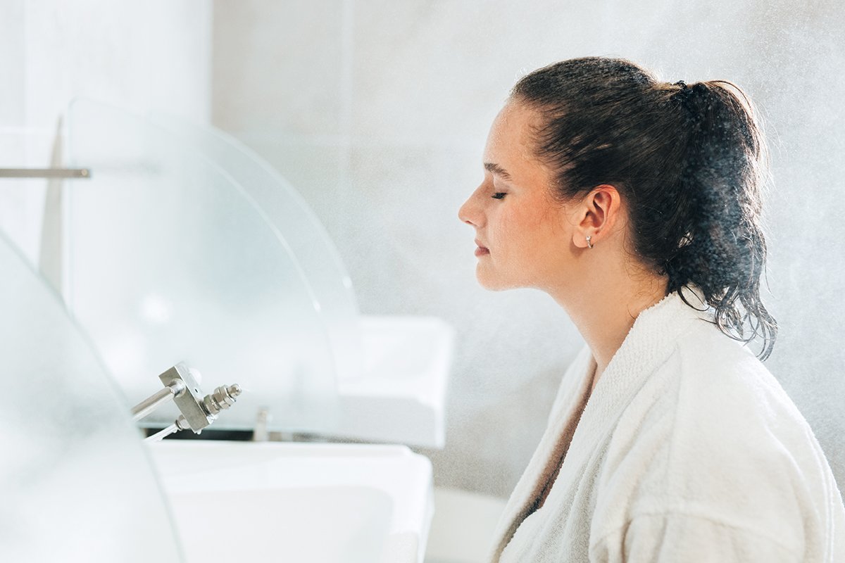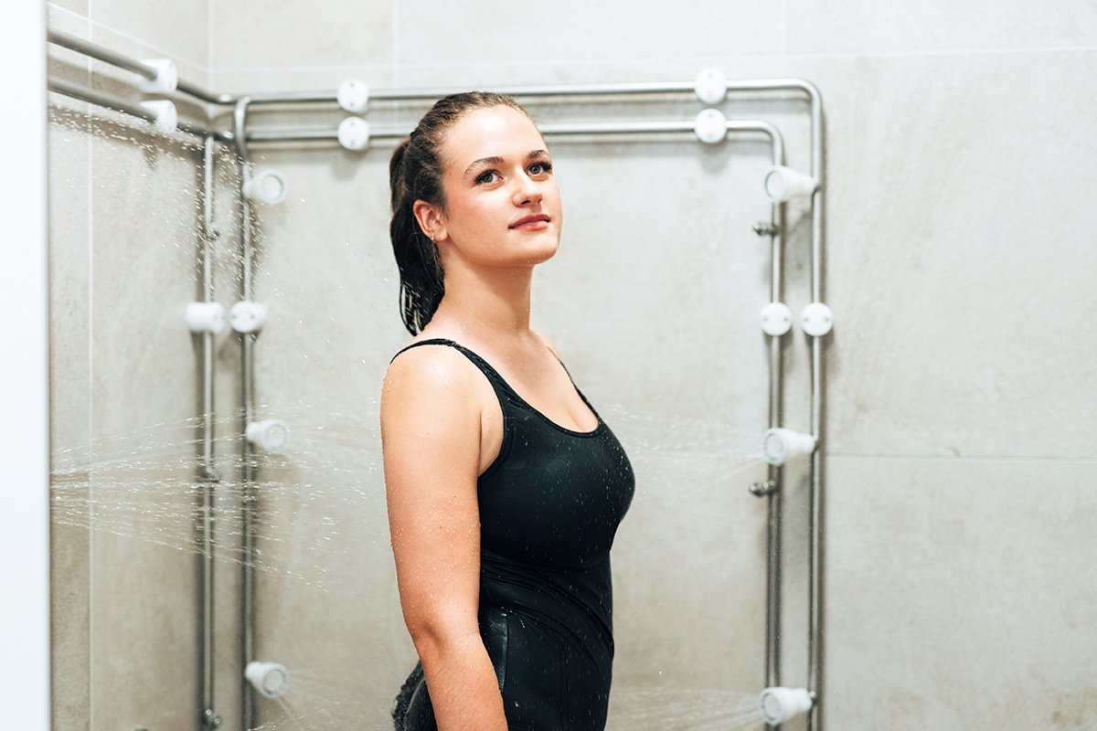 全方位から出るアベンヌ温泉水のシャワーを5分浴び、柔らかくなった角質層を洗い流す。続いてミストシャワーに切り替え、さらに5分間浴びることで抗炎症・血行促進効果が期待できるそう。