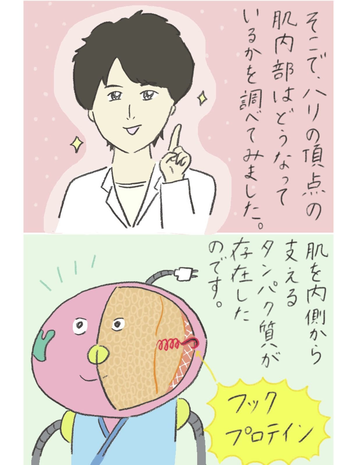 年齢を重ねても、ハリの頂点を高いままキープするには…? 研究チームは、顔の各パーツでの遺伝子発現を解析。その結果、肌を内側からつり上げる「フックプロテイン」の存在を解明。このプロテインを健やかに強く育てていくことがケアのカギとなります。