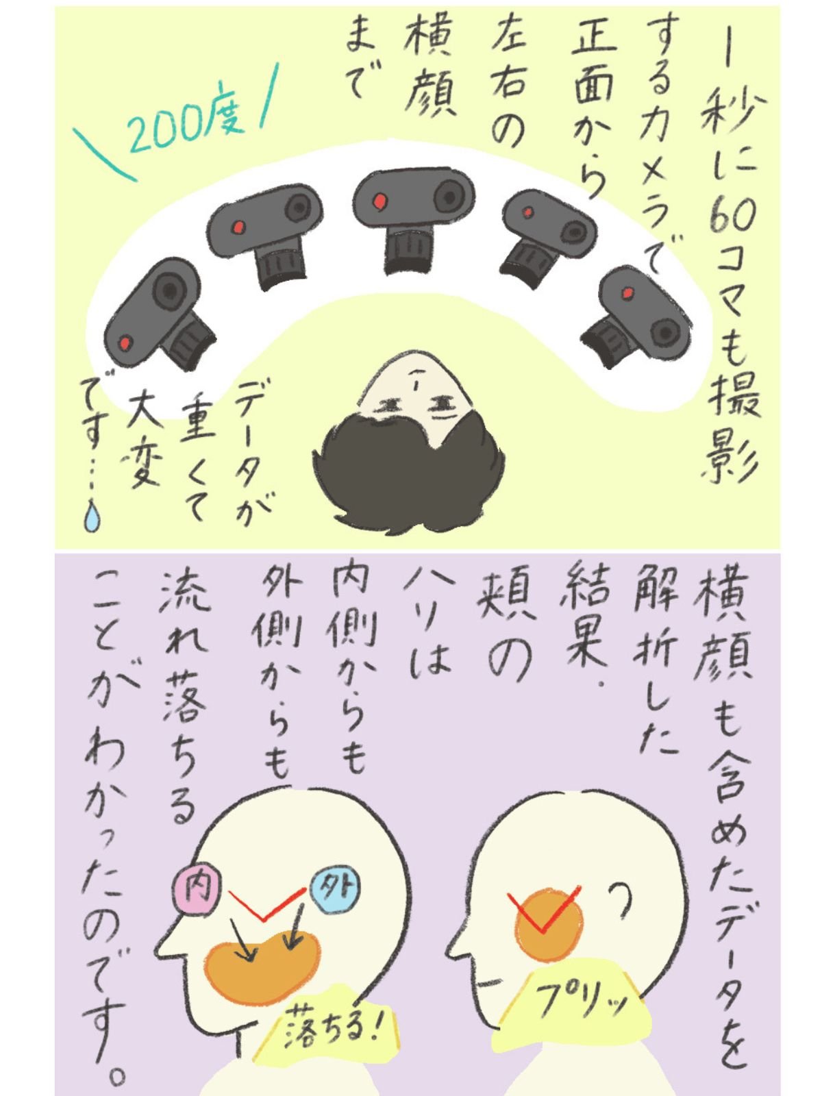 顔は、言うなれば球体に近い形をしています。顔を立体的に測定することで見えてきた事実をもとに、今回独自にハリの方程式を導き出し、「ハリの頂点」を定義。年齢やケアなどによっての変化を分析。その結果、ハリの頂点は1年に約1mm落ちていくという衝撃!