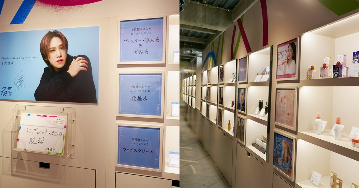 壁面にビューティアイテムがずらりと展示されている「Beauty Wall」では、とにかく様々なアイテムを知ることができます。中には、スペシャルパートナーの千賀健永さんのストックアイテムも!