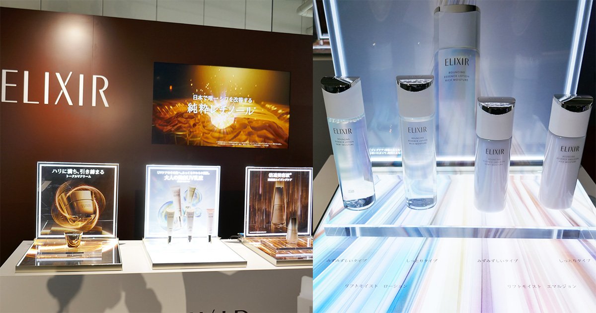 エリクシールのブースは、倍速美容液でおなじみ「エリクシール ザ セラム aa」や、2025年下半期に進化を遂げ、さらに人気急増中のローション&エマルジョンなど名品がズラリ!