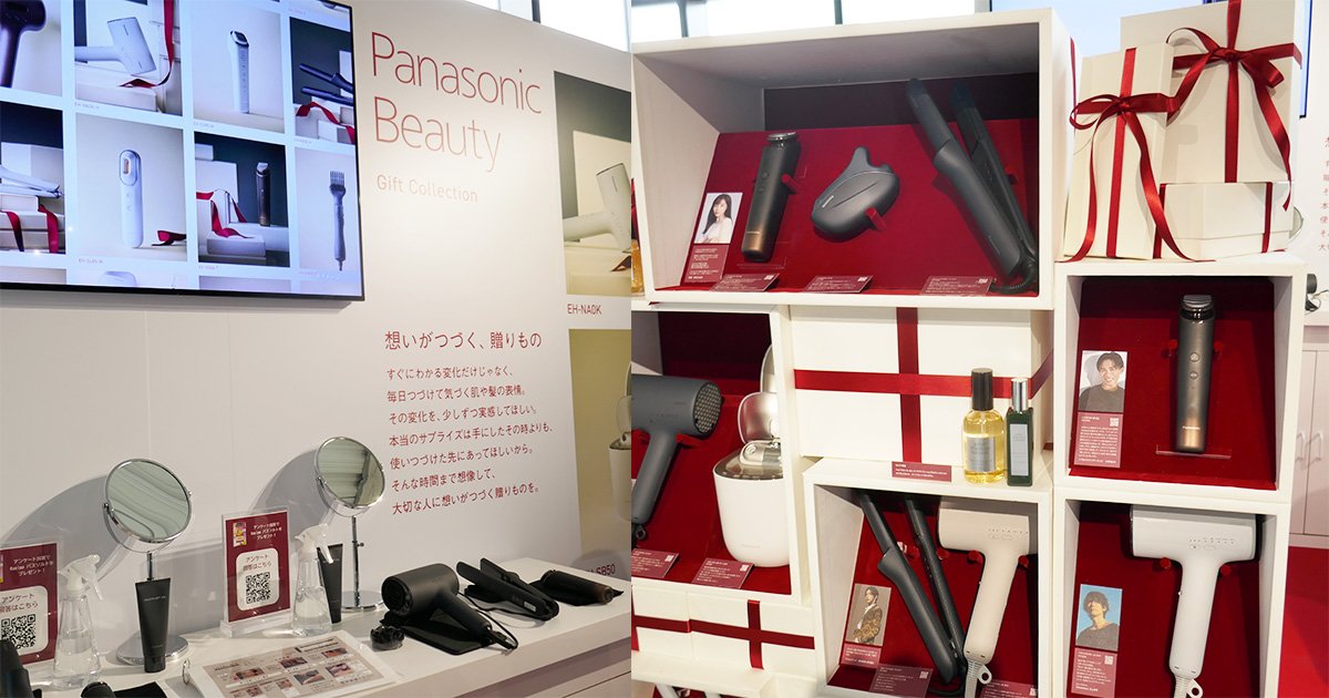 これからのシーズンのギフトにぴったりなパナソニック ビューティの美容家電!田中みな実さんやROIROMの二人他のギフトにおすすめのアイテムが展示されています。ギフト選びの参考になること間違いなし!