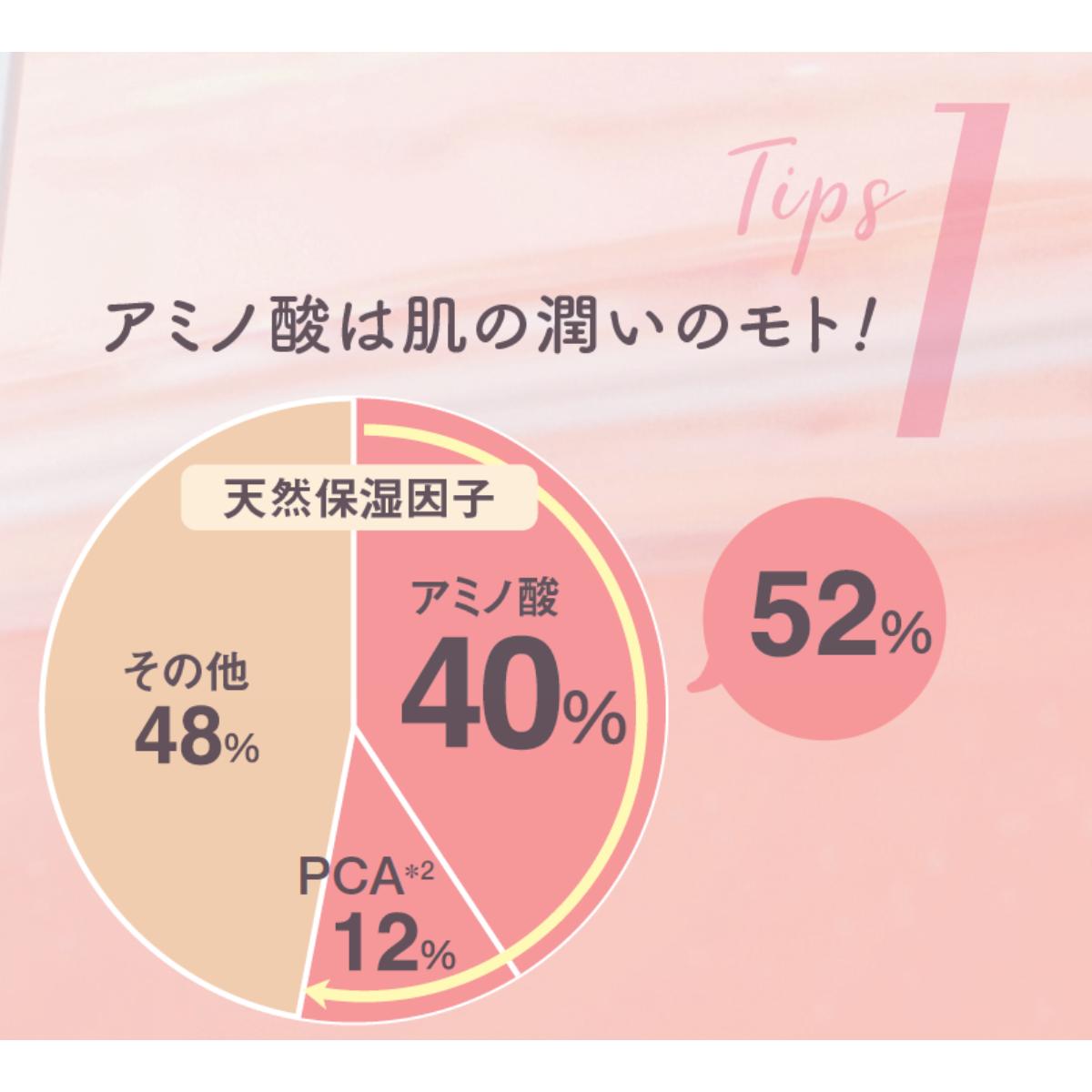 バリア機能に欠かせない天然保湿因子(NMF)は、肌が本来もっている天然の潤い成分。実は、その半分以上(約52%)がアミノ酸からできています。つまり、アミノ酸は肌の潤いのモトになる、とても大切な成分なんです!