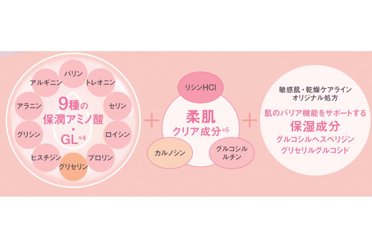 肌の「貯水力」に着目。潤いを保ち、肌のバリア機能をサポートする9種のアミノ酸にグリセリンをプラス。さらに、柔らかで透明感のある肌をサポートする厳選成分※5をIN。優しさ、+αの美しさをさらに追求した独自の新処方を搭載!