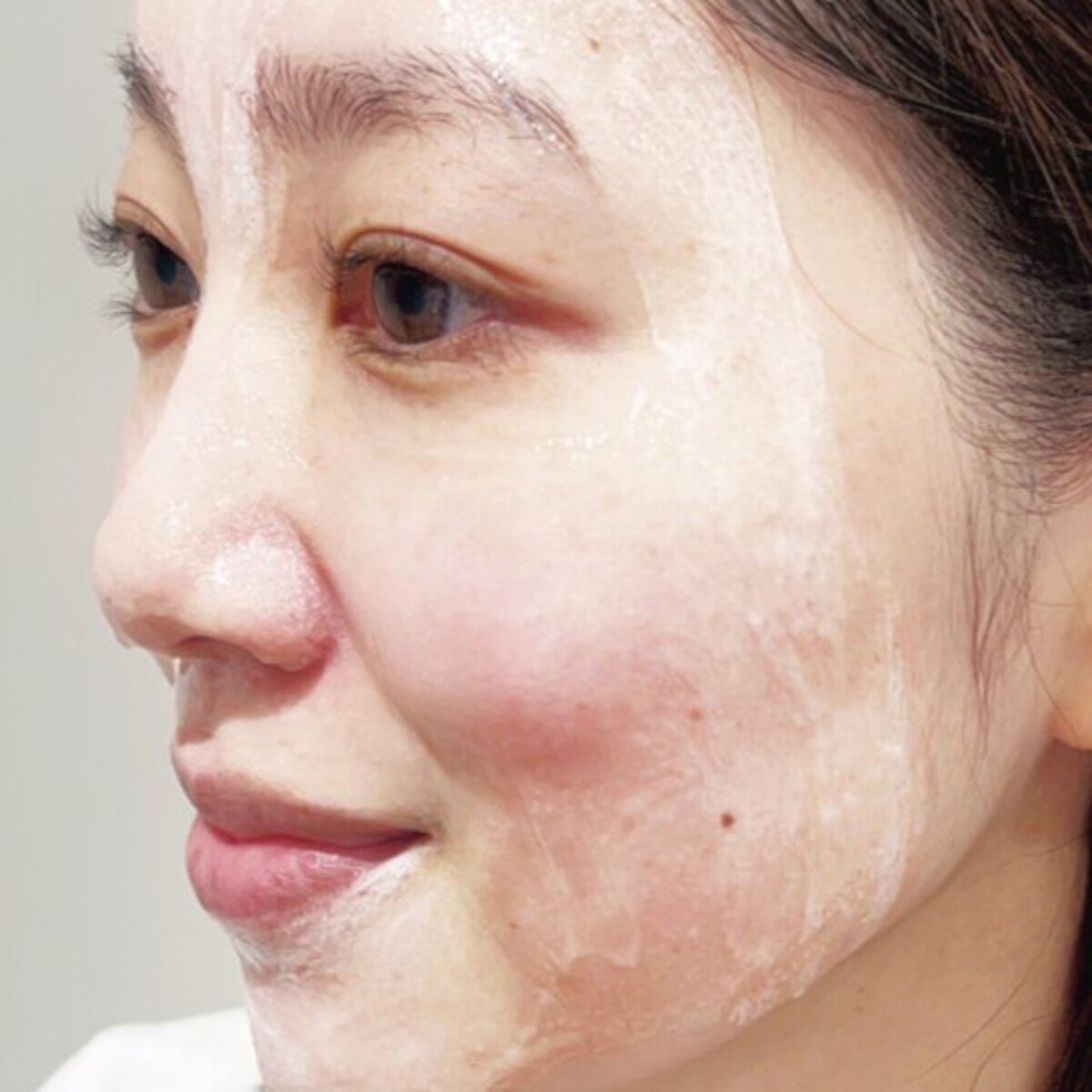 手と顔が乾いた状態で、パウチを半分に折り曲げてパック剤を出し、くるくるとマッサージしながら顔全体にまんべんなくのばす。