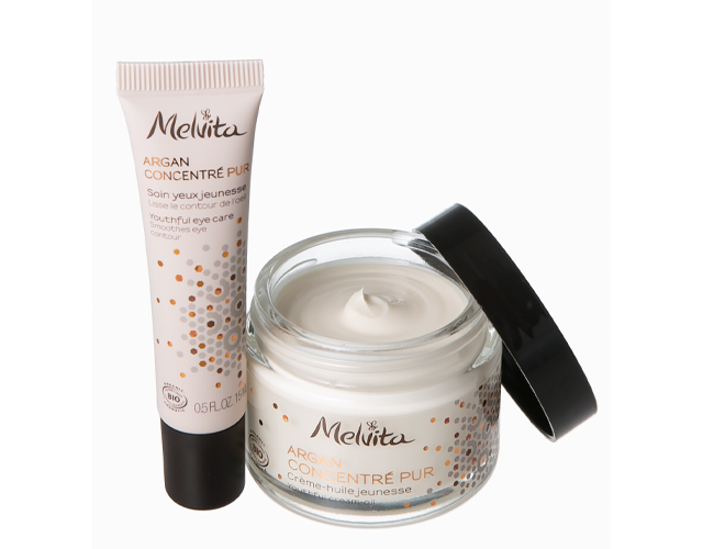 エイジングケアに優れた成分を含むアルガンオイルと、コラーゲンの生成を促すアルガンの果肉のダブルアルガン処方。肌を引き締めながら潤いでふっくら満たすオイルクリームと、小ジワの気になる目元に濃厚な潤いを与えるアイクリーム(左)で、乾燥知らずの立体素肌へ。