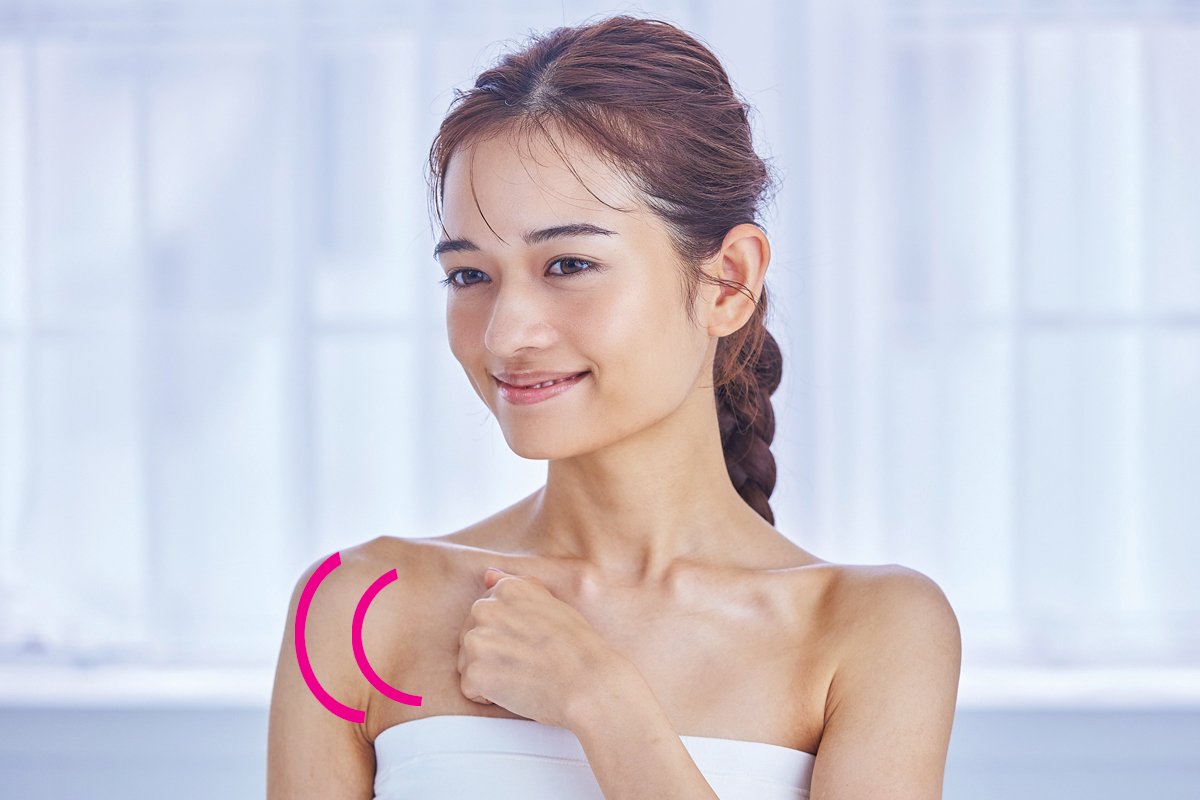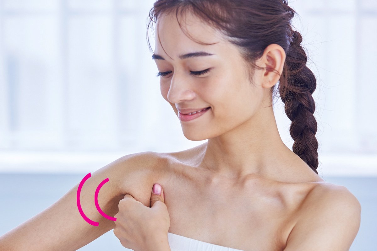 手に広げたコスメの香りを吸い込むように深呼吸。その後、デコルテや首筋をマッサージ。ストレスがたまっているときは胸やワキも固くなっているのでよくほぐして。