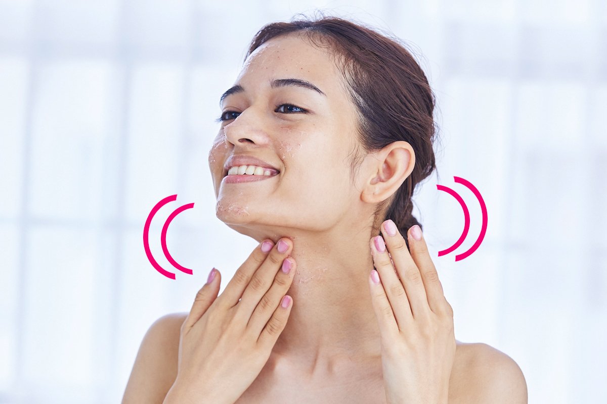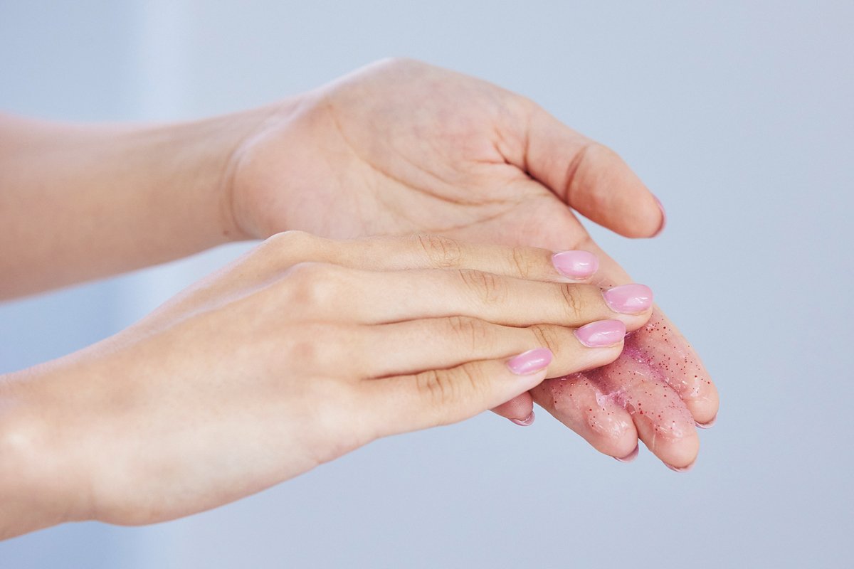 指の腹全体で練り合わせて柔らかくしてから、ペタペタとスタンプを押すように肌へ。こうするとこすらずケアできる。頻度は週に1-2 回。