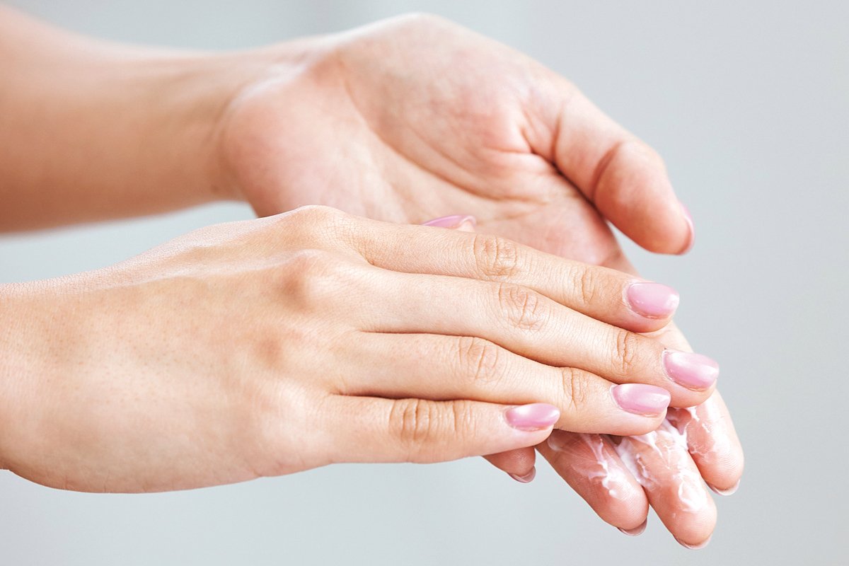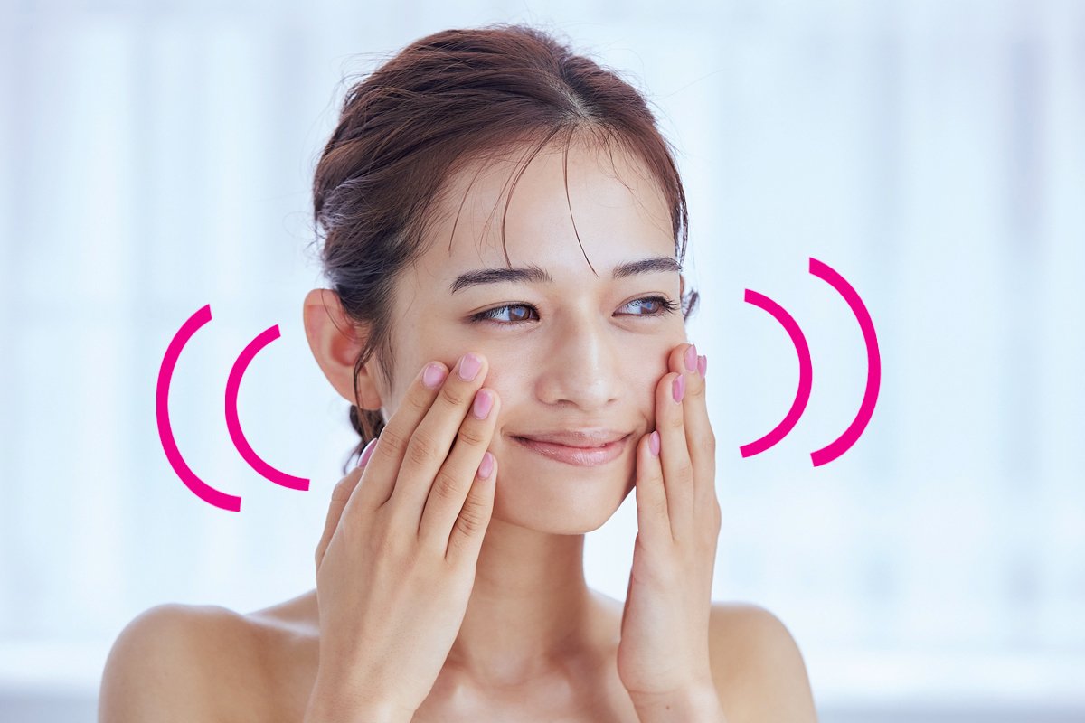 コスメはいったん、両手の指の腹に広げてから肌にのせる習慣を。指の腹の広い面で、ポンポンとおくようになじませると摩擦レス。