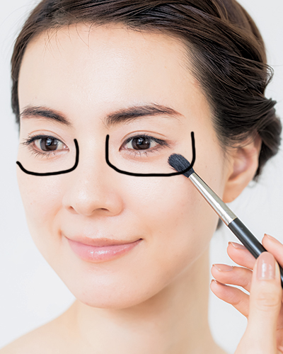 全体につけるとツヤが消え、乾燥しやすくもなってしまうので、ヨレが気になる目元だけに。アイシャドウブラシを使うと部分づけが簡単。