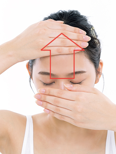 3.片方の手は鼻の上に置き、押さえるようにしながら、もう一方の手でおでこを引き上げる