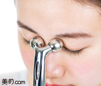 美容ツールを使い、目頭の上にあるくぼみを上下に小刻みに動かすようにして刺激を与えて。