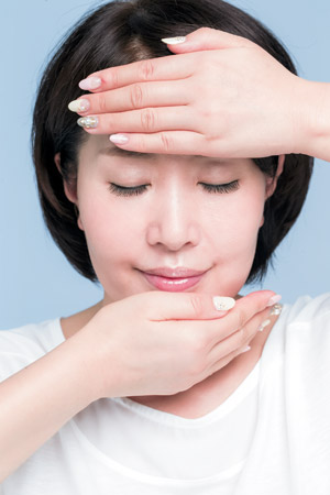 1.手のひら全体にコスメを広げ、手で顔を包むようにしてなじませる。顔の内側から外側へ。