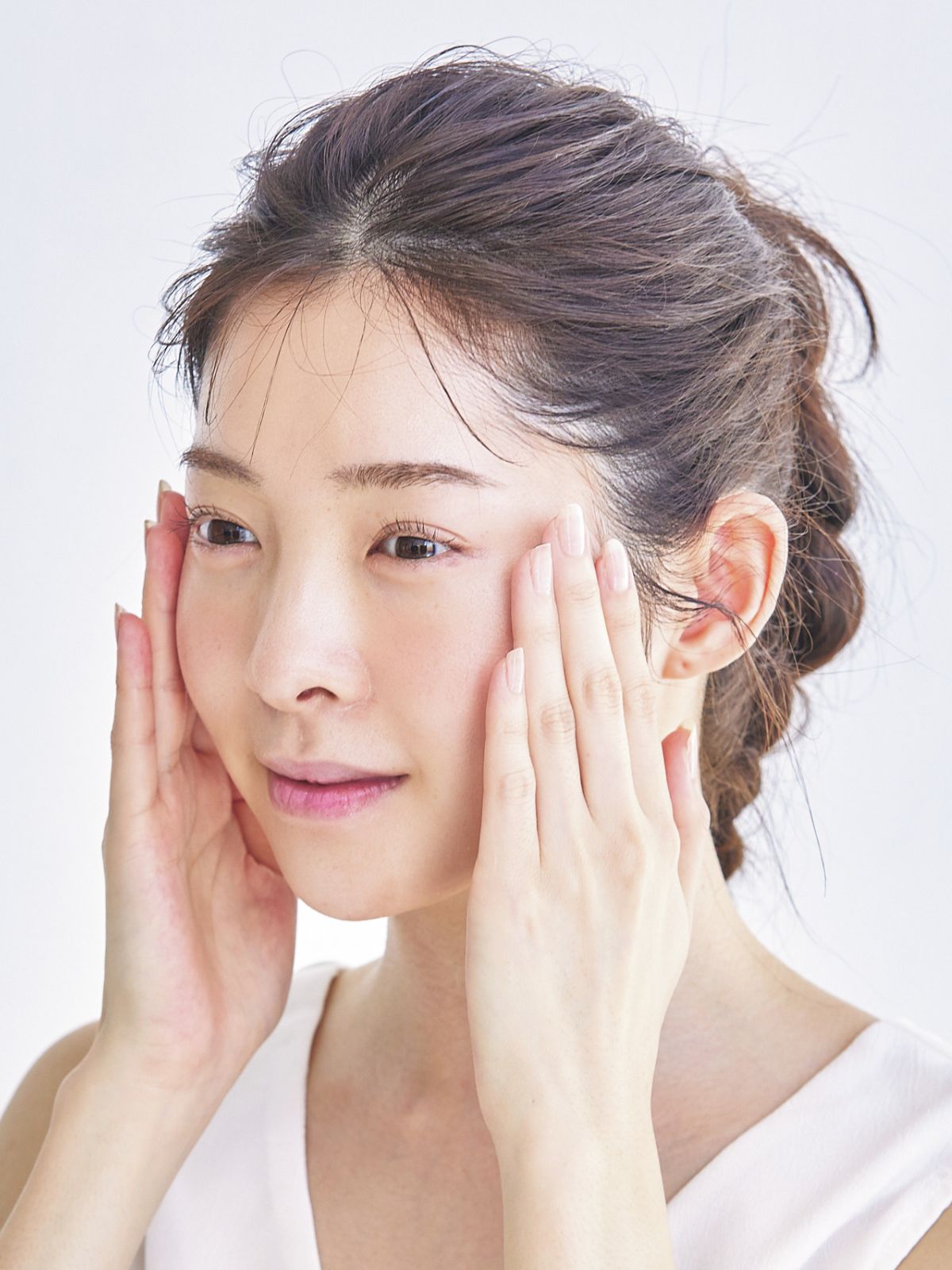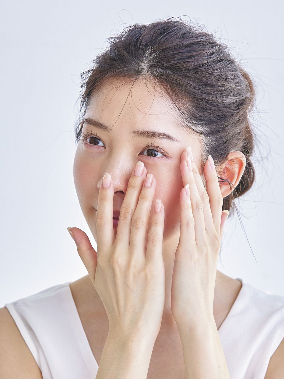 暑い季節でもベタつきなく心地よくクリームを使うために、塗り方にちょっとした工夫を。指の腹でポンポンとおいた後に軽く押さえてフィットさせる方法なら、涼やかでライトな感触に肌が整う。