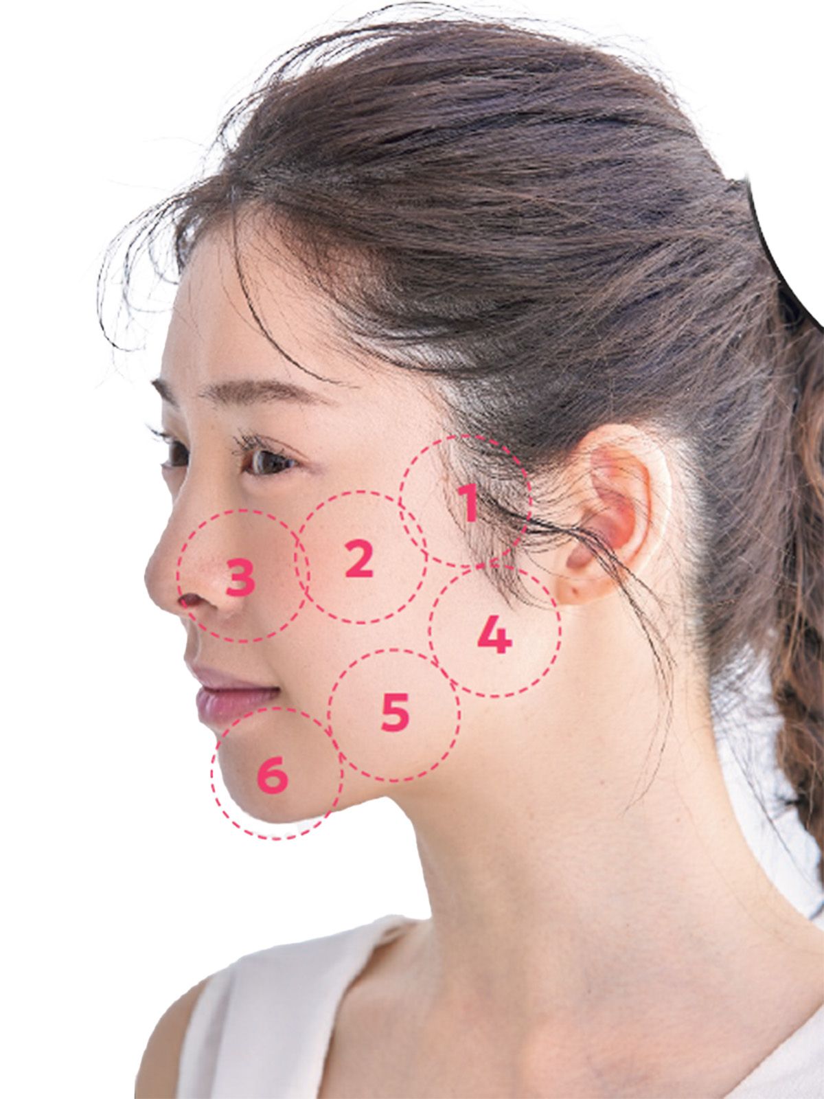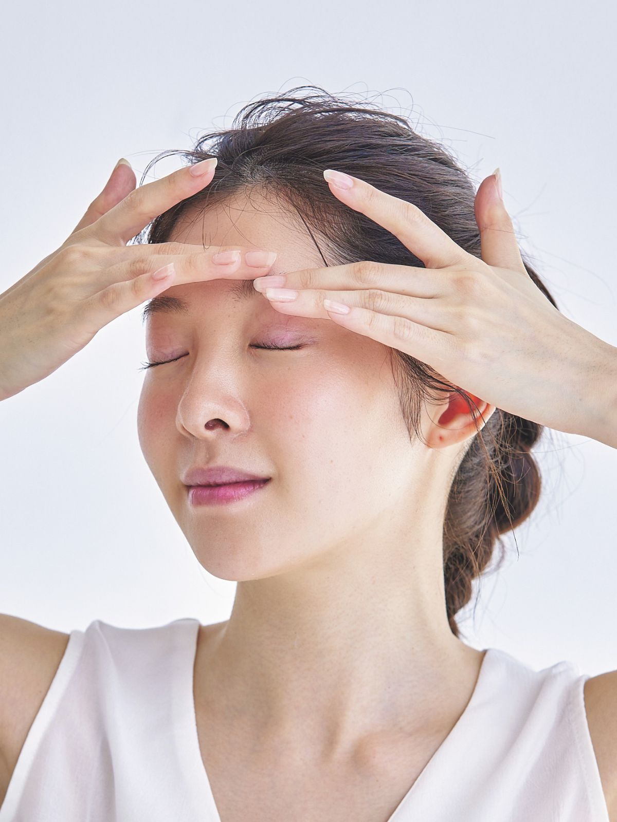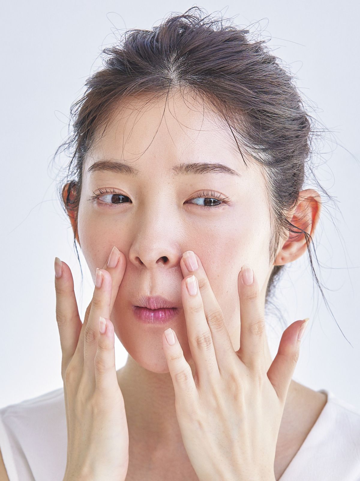 表情シワが定着しがちな眉周りは、クリームを塗るついでに表情筋をストレッチするプチマッサージを。指の腹で細かくさすり流し、筋肉にアイロンをかけるイメージで。