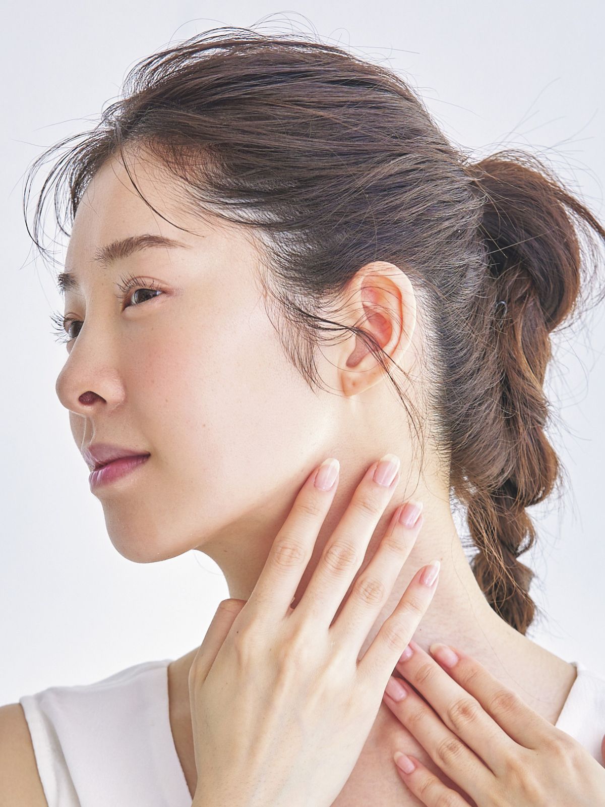 紫外線の影響をたっぷり受けている首もケア。朝は、手のひらに余ったものを、夜は新たに半量くらいのクリームをとり、首全体になじませていく。