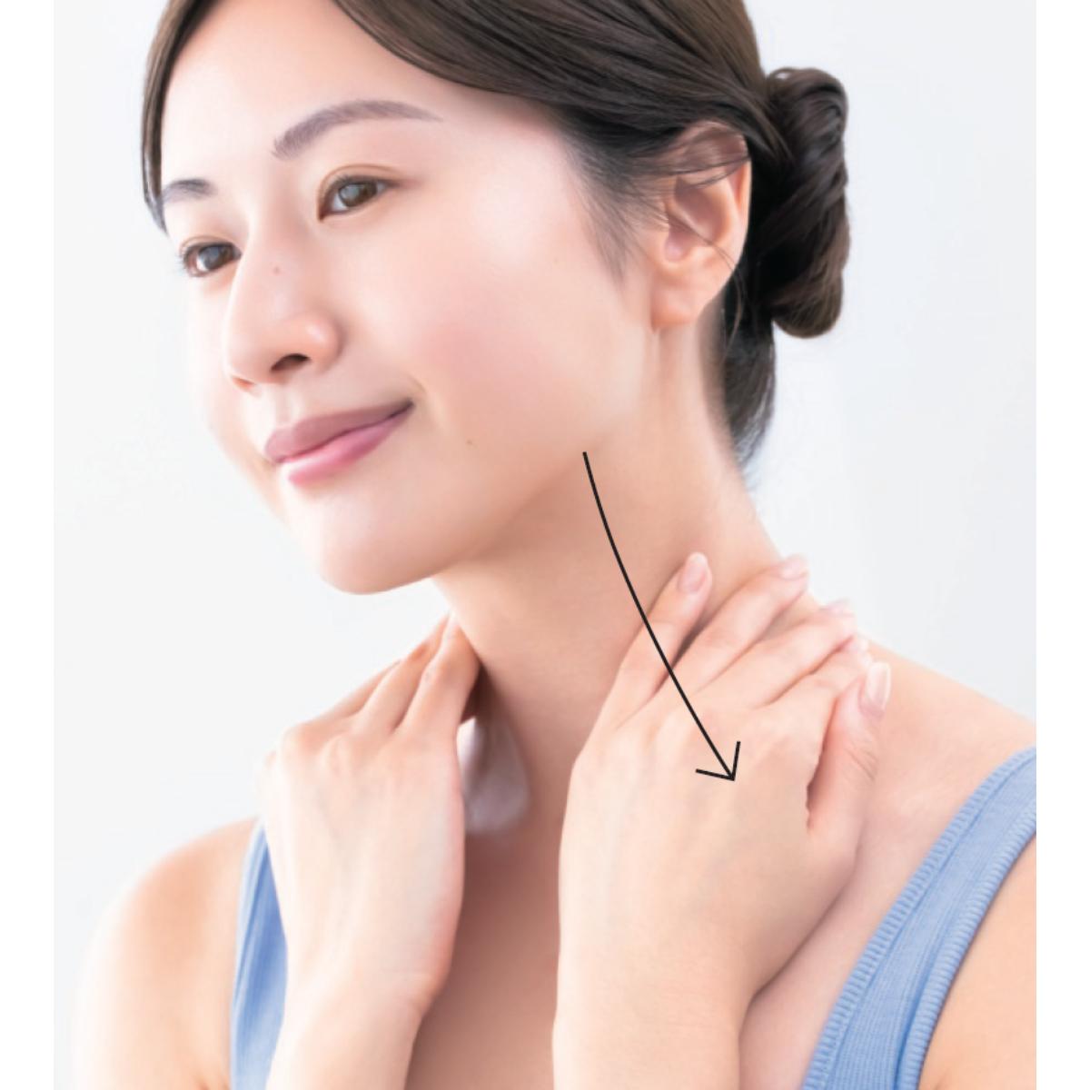 顔同様、くすみがちな首もあご下からデコルテに向かって流し塗り。軽く圧を加えると、むくみも解消されて顔もより明るく!