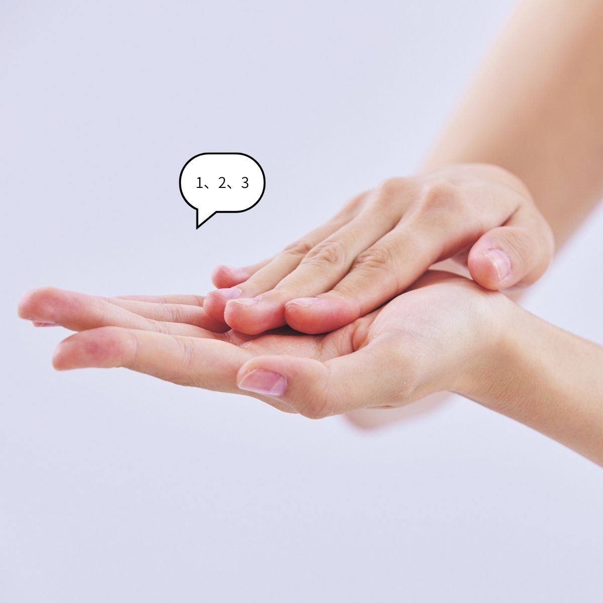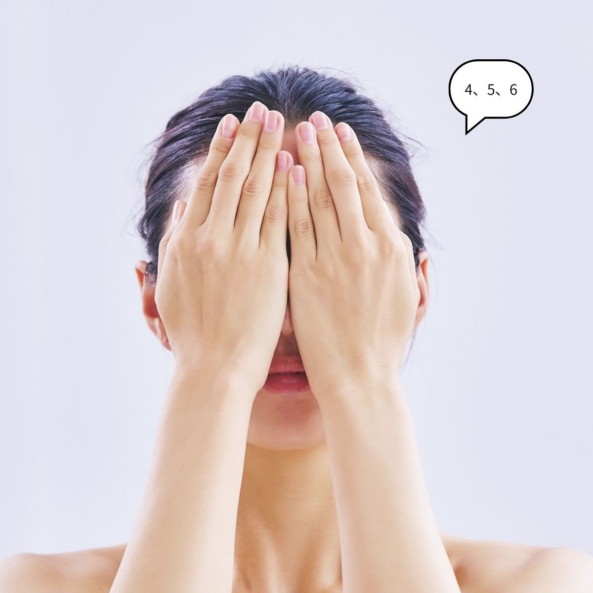 両手のひらを顔に当てて3秒間。まずは顔の中心から、少しずつ手の位置をずらします。