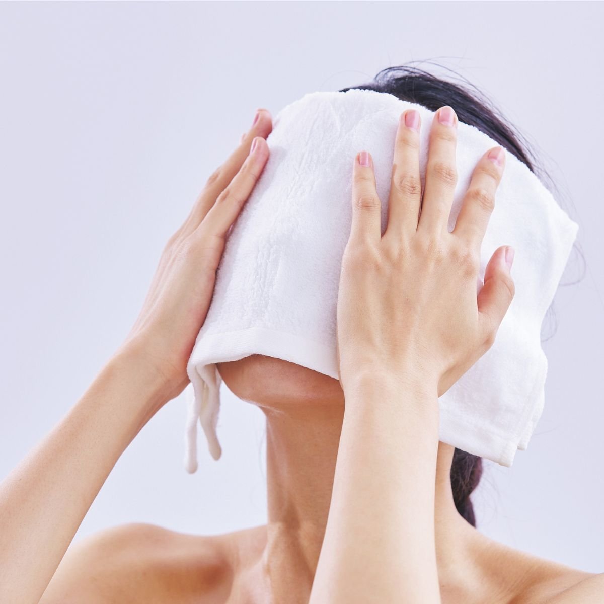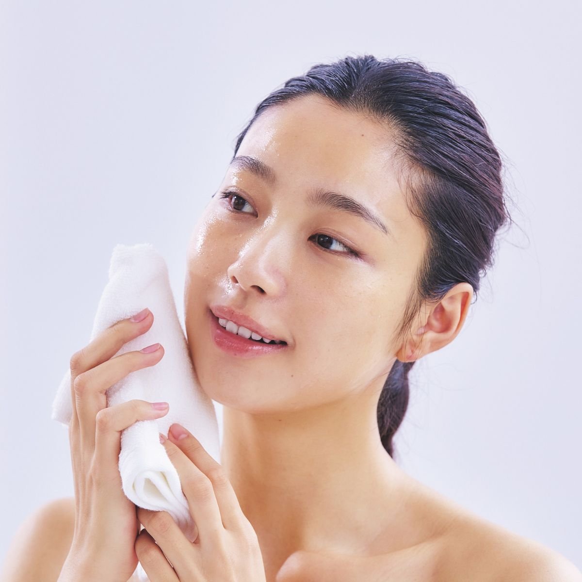 洗い上がりはタオルでポンポンと押さえる程度で充分。肌に残る湿り気も潤いのひとつと考えて。その後すかさず保湿します。