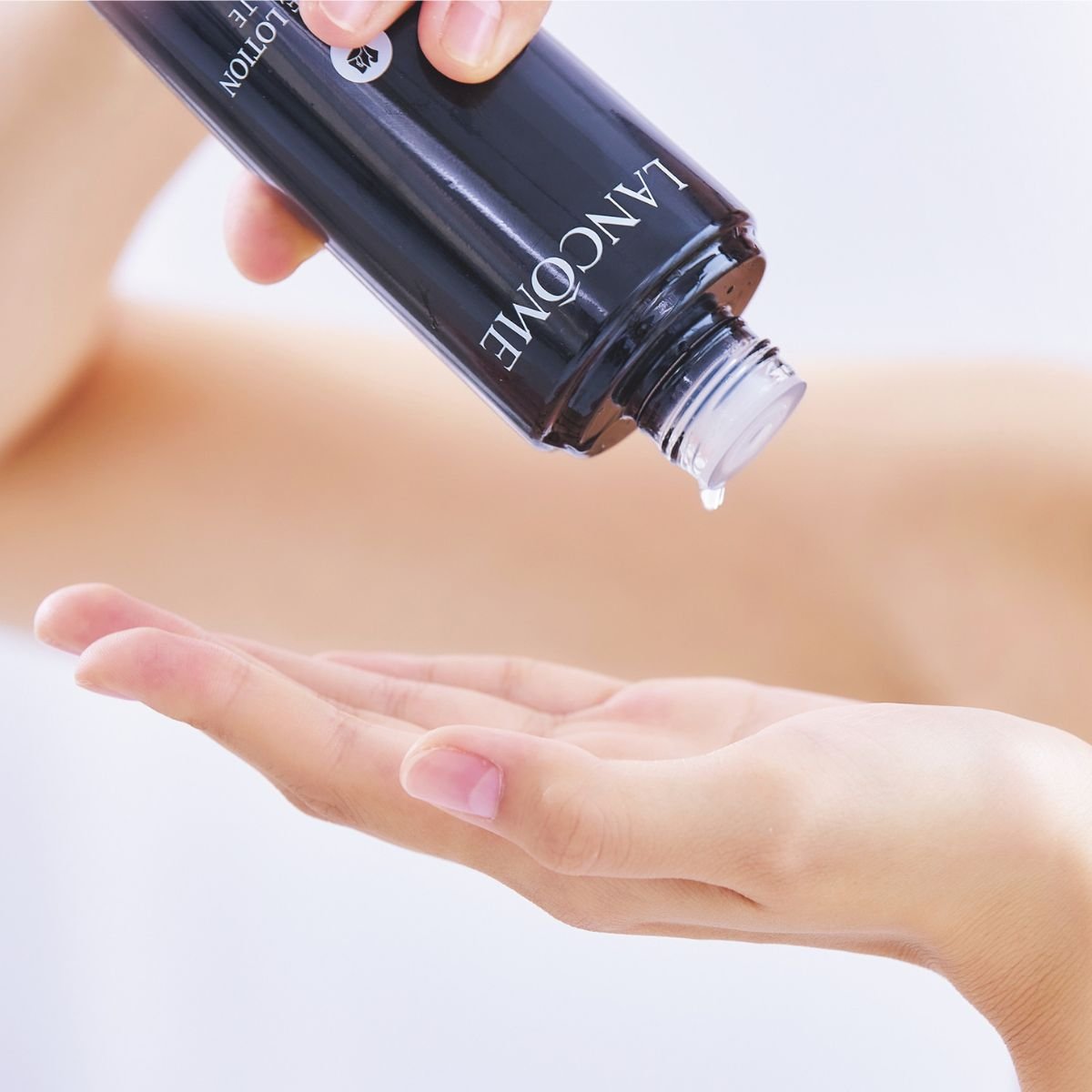 化粧水を手にとったら、両手のひら全体に広げます。この一手間が、時短効率保湿のキモ。
