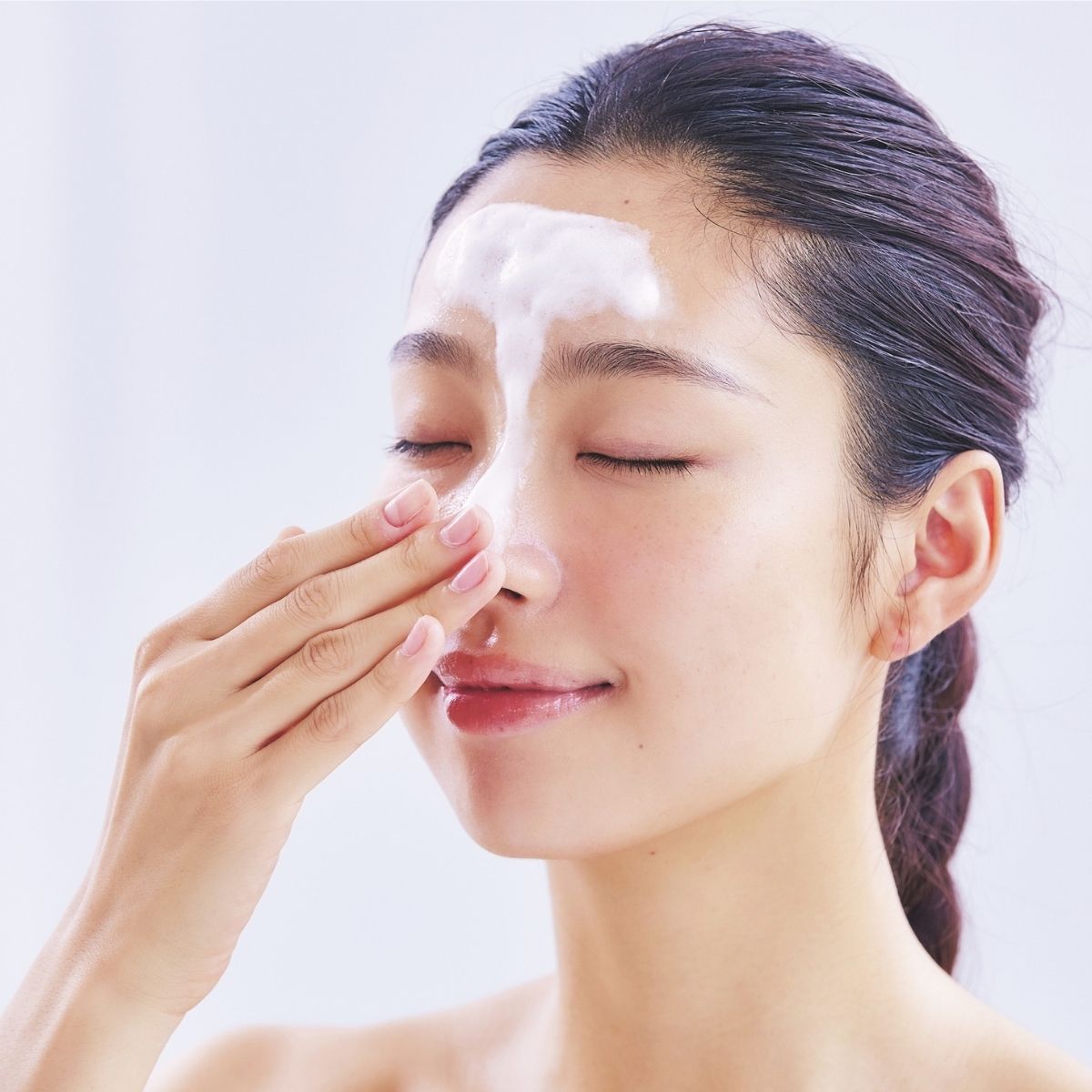 朝の洗顔は泡をサッと転がす程度でOK。その後ぬるま湯ですみずみまですすぎ、湿った状態の柔らかな肌へと整えます。