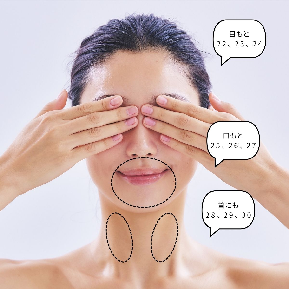 目元や口元など凹凸のある部位は指の腹を当てて3秒ずつ。仕上げに首もハンドプレス。