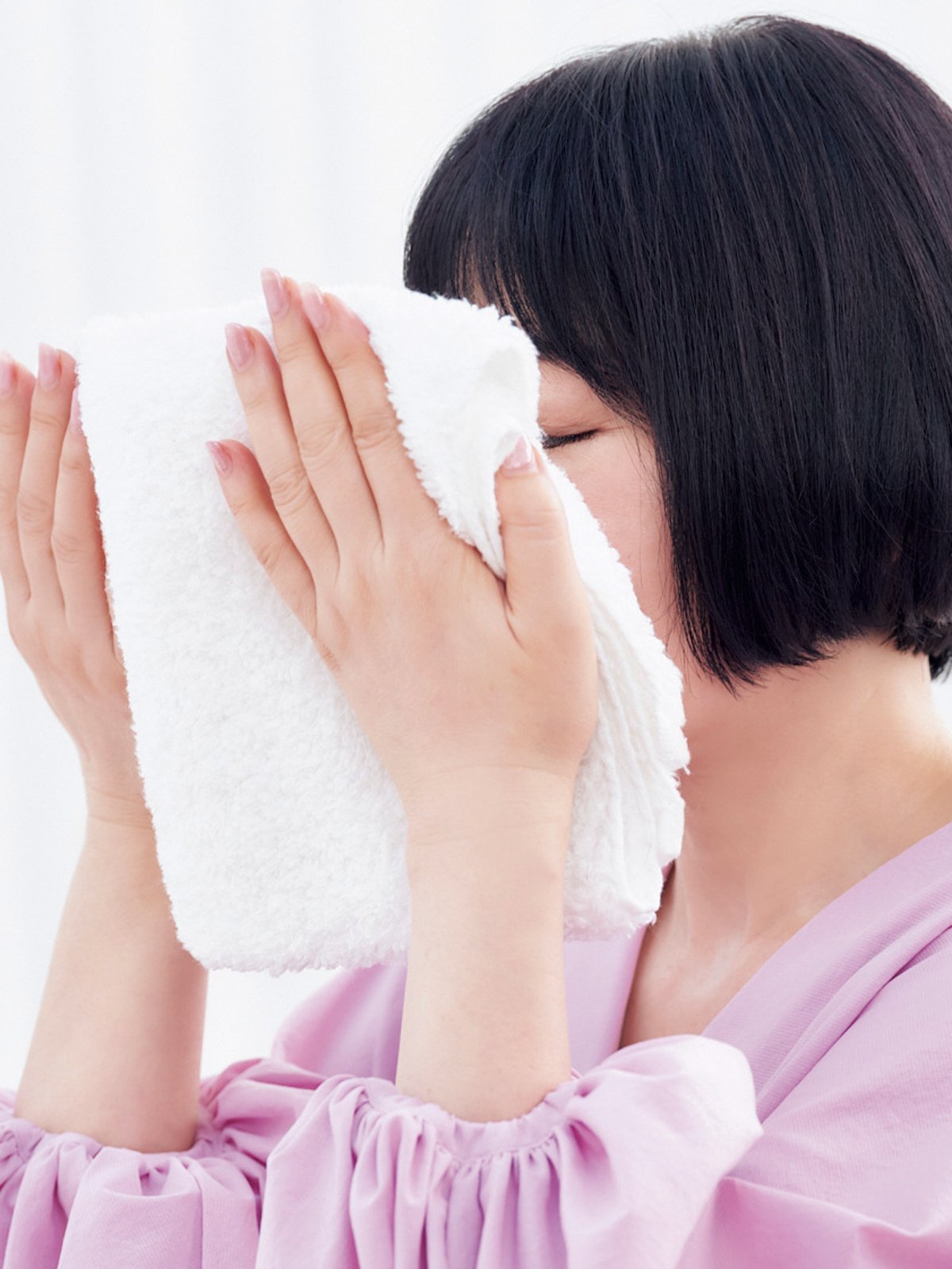 夜の洗顔後、乳液を顔全体にたっぷり塗ったらラップを貼って密封。5分程おいたら、ラップを剥がし、ホットタオルを顔に当てて蒸してから乳液を拭き取る。