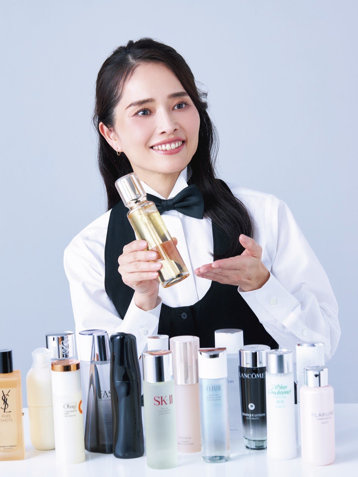 真理子さん:私は化粧水をミストボトルに移して洗面台に常備し、お風呂上がりに間髪入れず全身に浴びるように潤い補給を。首と顔、体の色の差や質感の違いをなくし均一に整えたいんです。その後、さらにじっくり、追い化粧水のケアも万全に。とにかく私の透明感ケアに、化粧水は欠かせない存在です。表面的な潤いではなく、内側からみずみずしく生きている感じのツヤ肌は、化粧水なしでは語れない!