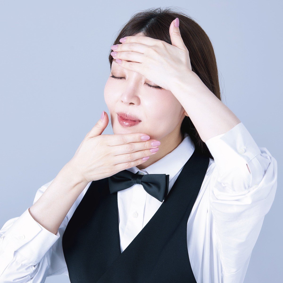 (2)そのまま手早く額やあごにも、手のひらをフィットさせるようにしっかりムラなく…